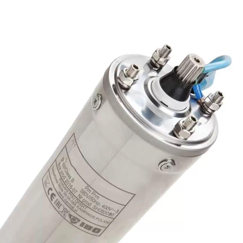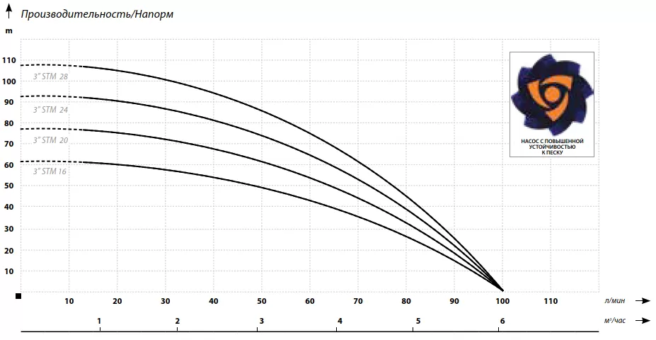 Многоступенчатые скважинный насосы диаметром 75 мм с повышенной устойчивостью к песку, рассчитанные на 3 и 4–дюймовые скважины. Насос IBO 3STM 16 обладает повышенной эффективностью к содержанию песка в перекачиваемой жидкости. Устойчивость к песку был достигнут благодаря использованию «плавающих лопастных колес» и выбору износостойких материалов. Скважинный насос IBO 3STM 16 обладает отменными характеристиками для насоса с небольшим диаметром. Максимальный напор насоса ИБО составляет 62 м, при этом максимальная производительность в пиковой точки показывает 6 м³/час. При таких напорно-расходных характеристиках мощность двигателя составляет всего 750 Вт. Конденсатор насоса встроен в двигатель, благодаря чему электрическая установка намного проще, чем в случае насосов со стартовой коробкой. Насос оснащен тепловой защитой, установленной в обмотке двигателя. Насос комплектуется кабелем 1 м. Основным преимуществом насоса IBO 3STM 16 является чрезвычайно высокая производительность для насоса диаметром 75 мм со скоростью до 6 м³/час.