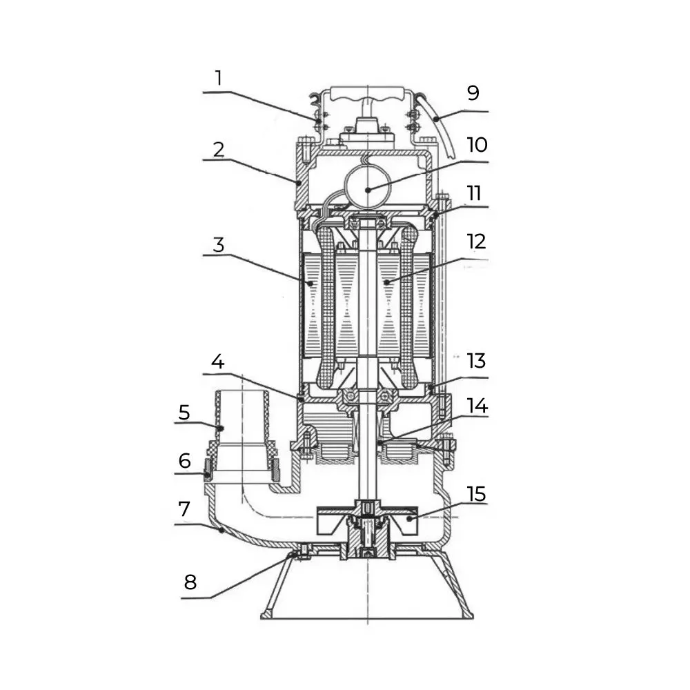 Насос представляет собой моноблочный агрегат, состоящий из гидравлической части и электродвигателя. Электродвигатель является однофазным асинхронным и оснащен пусковым конденсатором. Он размещен в закрытом от попадания жидкости кожухе, что обеспечивает безопасность и защиту от возможных повреждений. Корпус насоса имеет рукоятку в верхней части кожуха, предназначенную для удобной переноски и подвешивания насоса. Это удобно при его транспортировке или перемещении на месте использования.