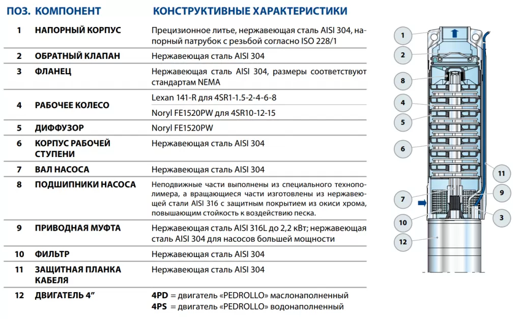 Устройство насоса Pedrollo 6SR12/15-P: