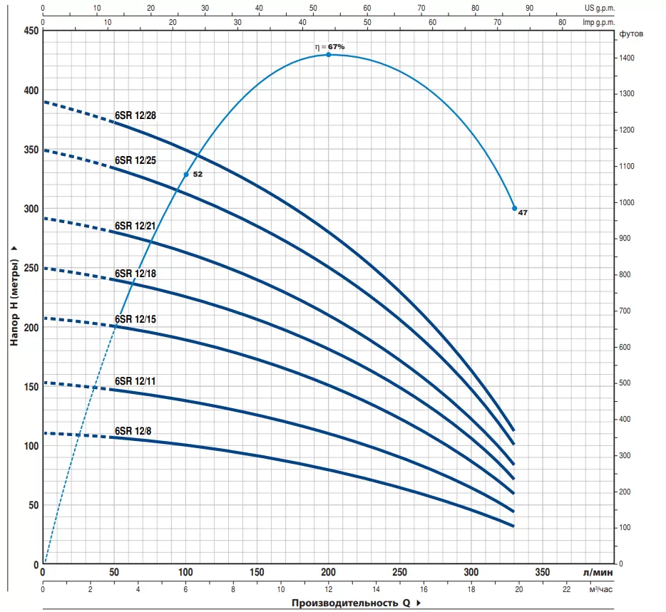 Глубинный насос Pedrollo 6SR12/21-P, отличается объективной ценой и надежной работой всех исполнительных механизмов. Насос Pedrollo 6SR12/21-P достаточно простой в эксплуатации и обслуживании, поэтому отлично подходит как для домашнего, так и промышленного применения.В основе работы Pedrollo 6SR12/21-P лежит конструктивно простой, но функционально успешный многоступенчатый центробежный принцип. Электрический двигатель подключается к агрегату через суппорт, в соответствии с нормативами международного стандарта NEMA. Мощность электродвигателя насоса составляет 11000 Вт . И при таких показателях мощности насос обладает максимальным напором в 292 метров и максимальной производительностью 19.8 м3/час. Функционирование Pedrollo 6SR12/21-P идентично большинству устройств, основанных на центробежных механизмах подачи воды. Жидкость втягивается в корпус устройства благодаря центробежной силе, создаваемой рабочими колесами, которые также проталкивают воду через все тело насоса "диаметр насоса 6"", а затем в нагнетающий патрубок "диаметр патрубка 3"", через который вода и попадает к конечному потребителю. Главной особенностью насоса Pedrollo 6SR12/21-P является малый диаметр корпуса агрегата, а также то, что перекачиваемая вода не касается стенок двигателя. Между жидкостью и корпусом движущей установки располагается прослойка из технологического масла, которая и предотвращает попадание мелких частиц непосредственно в исполнительный механизм. В то время как охлаждение электропривода происходит за счет верхнего способа забора воды, т.е. перекачиваемая жидкость находится всегда выше уровня расположения двигателя. Насос питается от сети в 380 в и комплектуется кабелем 4 метров.