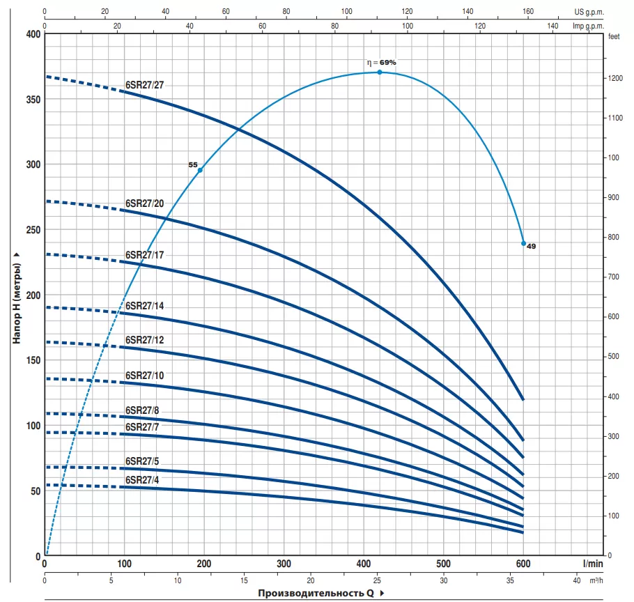 Глубинный насос Pedrollo 6SR27/7-P, отличается объективной ценой и надежной работой всех исполнительных механизмов. Насос Pedrollo 6SR27/7-P достаточно простой в эксплуатации и обслуживании, поэтому отлично подходит как для домашнего, так и промышленного применения.В основе работы Pedrollo 6SR27/7-P лежит конструктивно простой, но функционально успешный многоступенчатый центробежный принцип. Электрический двигатель подключается к агрегату через суппорт, в соответствии с нормативами международного стандарта NEMA. Мощность электродвигателя насоса составляет 7500 Вт . И при таких показателях мощности насос обладает максимальным напором в 95 метров и максимальной производительностью 36 м3/час. Функционирование Pedrollo 6SR27/7-P идентично большинству устройств, основанных на центробежных механизмах подачи воды. Жидкость втягивается в корпус устройства благодаря центробежной силе, создаваемой рабочими колесами, которые также проталкивают воду через все тело насоса "диаметр насоса 6"", а затем в нагнетающий патрубок "диаметр патрубка 3"", через который вода и попадает к конечному потребителю. Главной особенностью насоса Pedrollo 6SR27/7-P является малый диаметр корпуса агрегата, а также то, что перекачиваемая вода не касается стенок двигателя. Между жидкостью и корпусом движущей установки располагается прослойка из технологического масла, которая и предотвращает попадание мелких частиц непосредственно в исполнительный механизм. В то время как охлаждение электропривода происходит за счет верхнего способа забора воды, т.е. перекачиваемая жидкость находится всегда выше уровня расположения двигателя. Насос питается от сети в 380 в и комплектуется кабелем 4 метров.